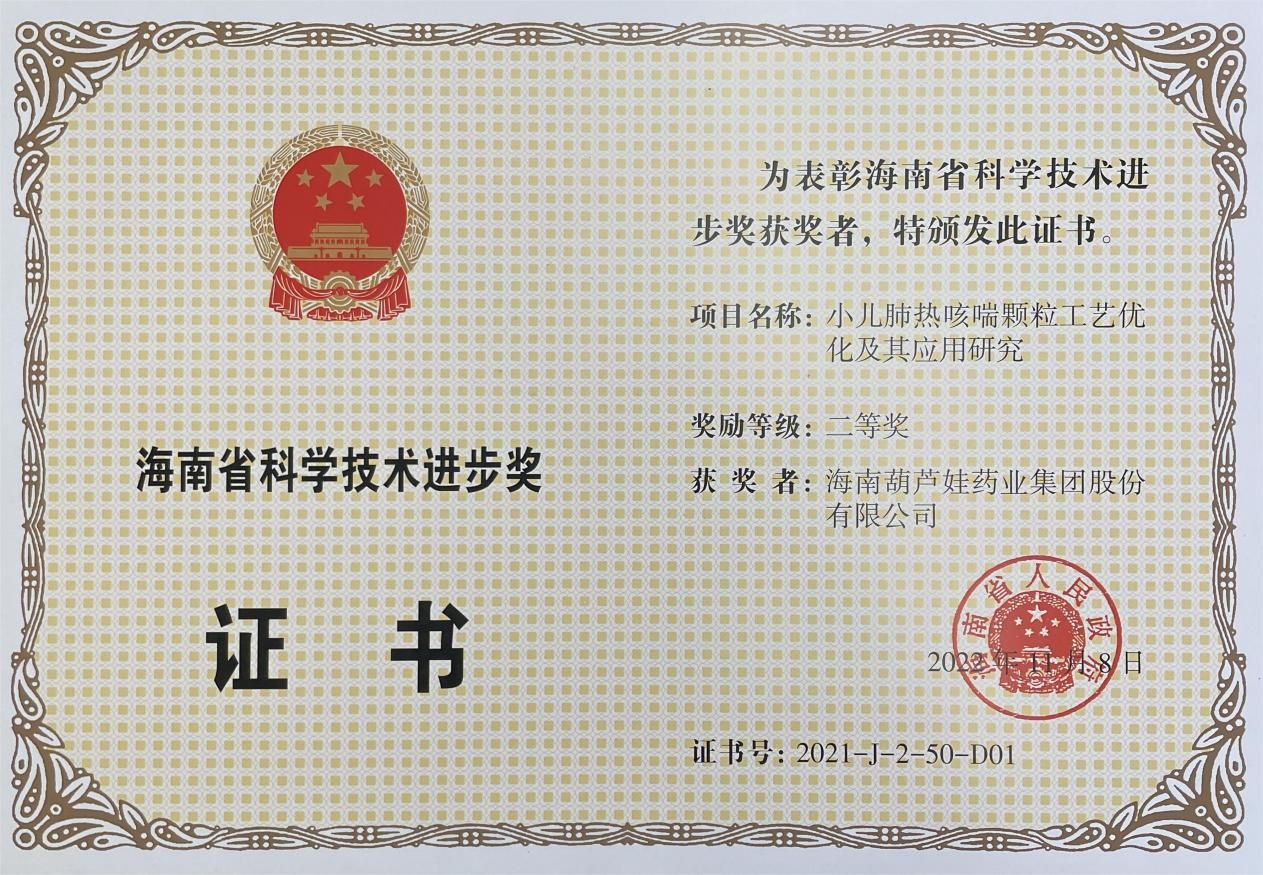为此,小儿肺热咳喘颗粒的制备方法获得了第二十一届中国专利优秀奖(2019年),专利申请号:ZL201010134951,此次作为专利技术的应用,获得了2021年度海南省科学技术进步奖二等奖。在此之前,东升国际牌小儿肺热咳喘颗粒还多次被授予“临床价值中成药品牌”、“中国连锁药店最具合作价值单品”,荣登“中国医药品牌榜”。
